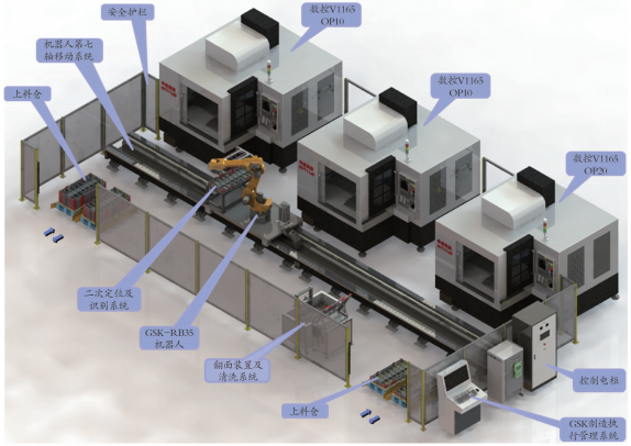 ? ? ? ??項目采用3臺數(shù)控機床加工系統(tǒng)、1臺GSK-RB35 機器人、機器人第七軸移動系統(tǒng)、上下料倉、二次定位及識別系統(tǒng)、翻面裝置及清洗系統(tǒng),以及 GSK 制造執(zhí)行系統(tǒng)等集成一體的智能加工生產(chǎn)線 ; 根據(jù)生產(chǎn)訂單需求不同,可同時進行一種或多種產(chǎn)品柔性化混合生產(chǎn) ; 實現(xiàn)不同工藝、型號批次產(chǎn)品的識別判斷,可以快速制定生產(chǎn)計劃、柔性轉換智能生產(chǎn),提高生產(chǎn)效率、保證產(chǎn)品質量。