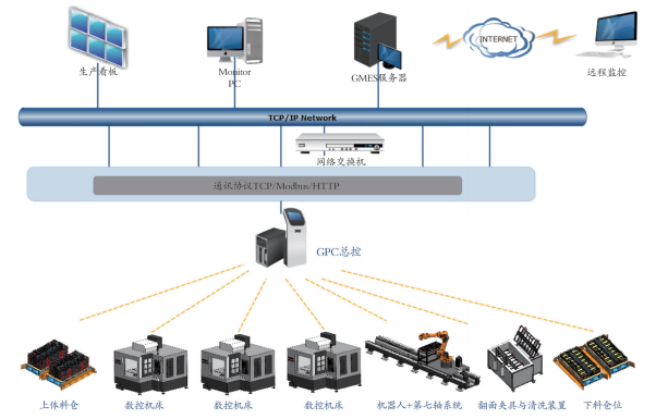 ? ? ? ??GSK 智能制造執(zhí)行系統(tǒng)針對企業(yè)生產(chǎn)特點建立以 GMES 為核心的生產(chǎn)計劃協(xié)同管理平臺,具備網(wǎng)絡化監(jiān)視、控制、數(shù)據(jù)采集等功能。利用GSK-LINK 總線實現(xiàn)數(shù)控機床、工業(yè)機器人系統(tǒng)、識別系統(tǒng)及生產(chǎn)輔助設備的連接進行智能化監(jiān)控